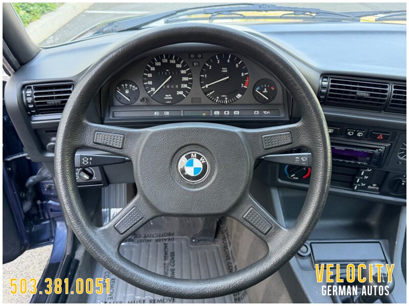 This 1990 BMW 320i Touring is a European-market example that was acquired in 2026 and subsequently imported to the US. it is finished in blue over black leather and powered by a 2.0-liter inline-six linked to a five-speed manual transmission. Equipment includes 15? basketweave alloy wheels, four-wheel disc brakes, European-market “smiley” headlights, a manually operated sunroof, a rear spoiler, a Kenwood CD stereo, and a heater. This E30 Touring shows 271k kilometers (~168k miles) and is now offered with a clean Carfax report and a clean Oregon title.